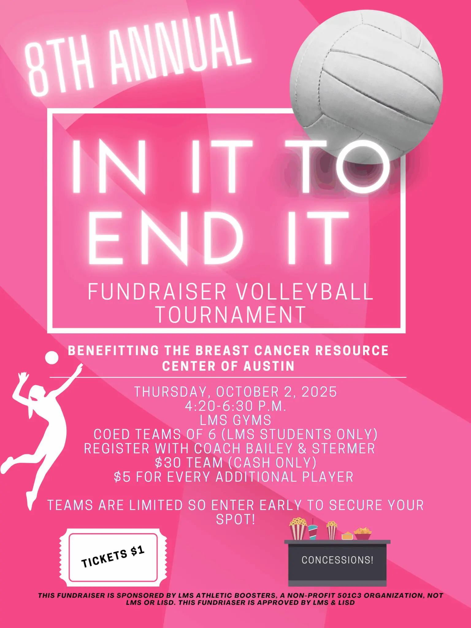Hosted by Leander Middle School Girls Athletics; entry fees for teams collected, tickets sold at door; concession items donated by parents. All proceeds donated to BCRC