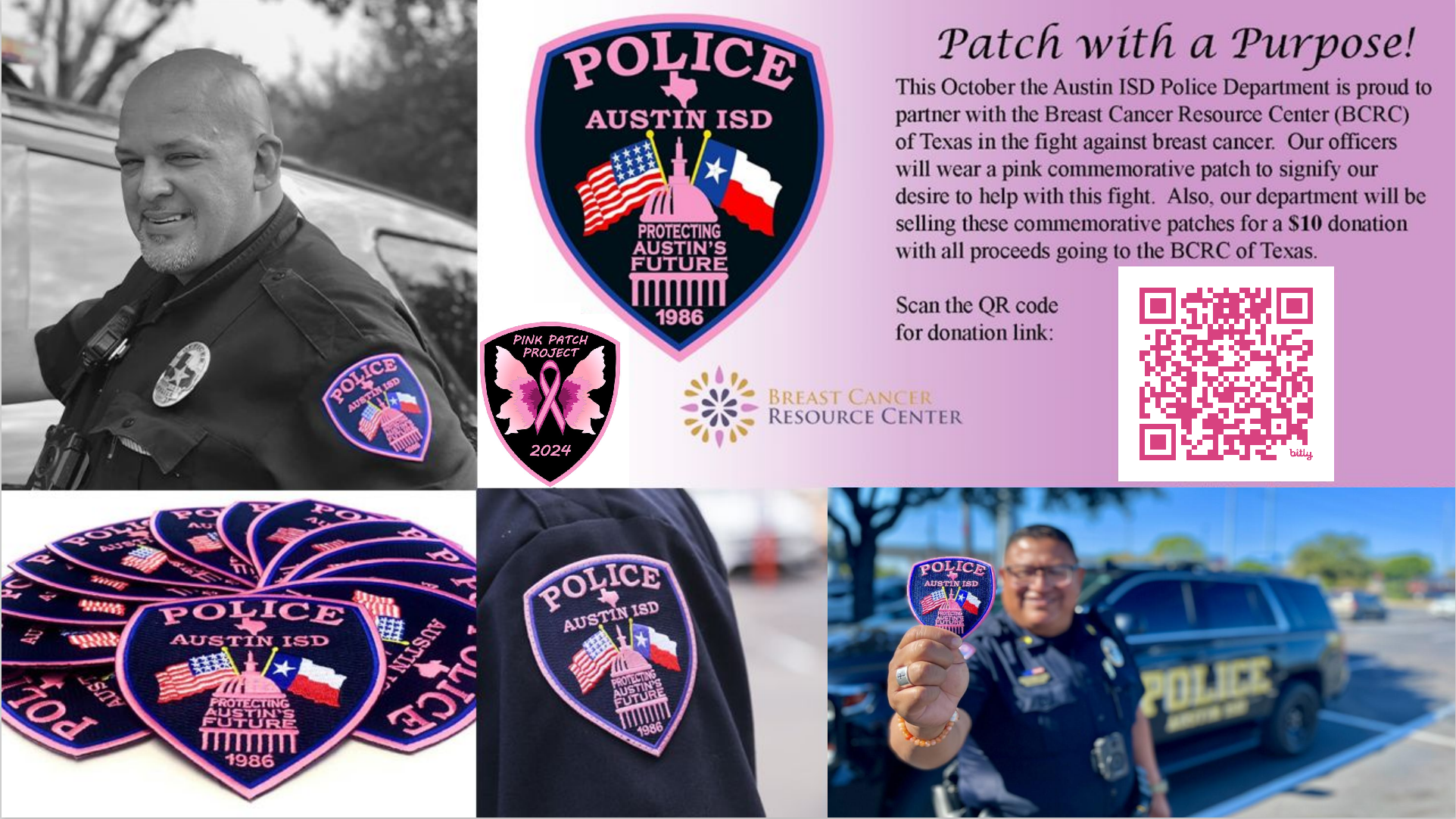 From October 1st through October 31st, officers of the Austin ISD Police Department are authorized to wear a special pink version of the Department’s shoulder patch on-duty. During this time—and while supplies last—the pink patch will be available for “purchase” through donations to the Breast Cancer Resource Center of Texas (BCRC).